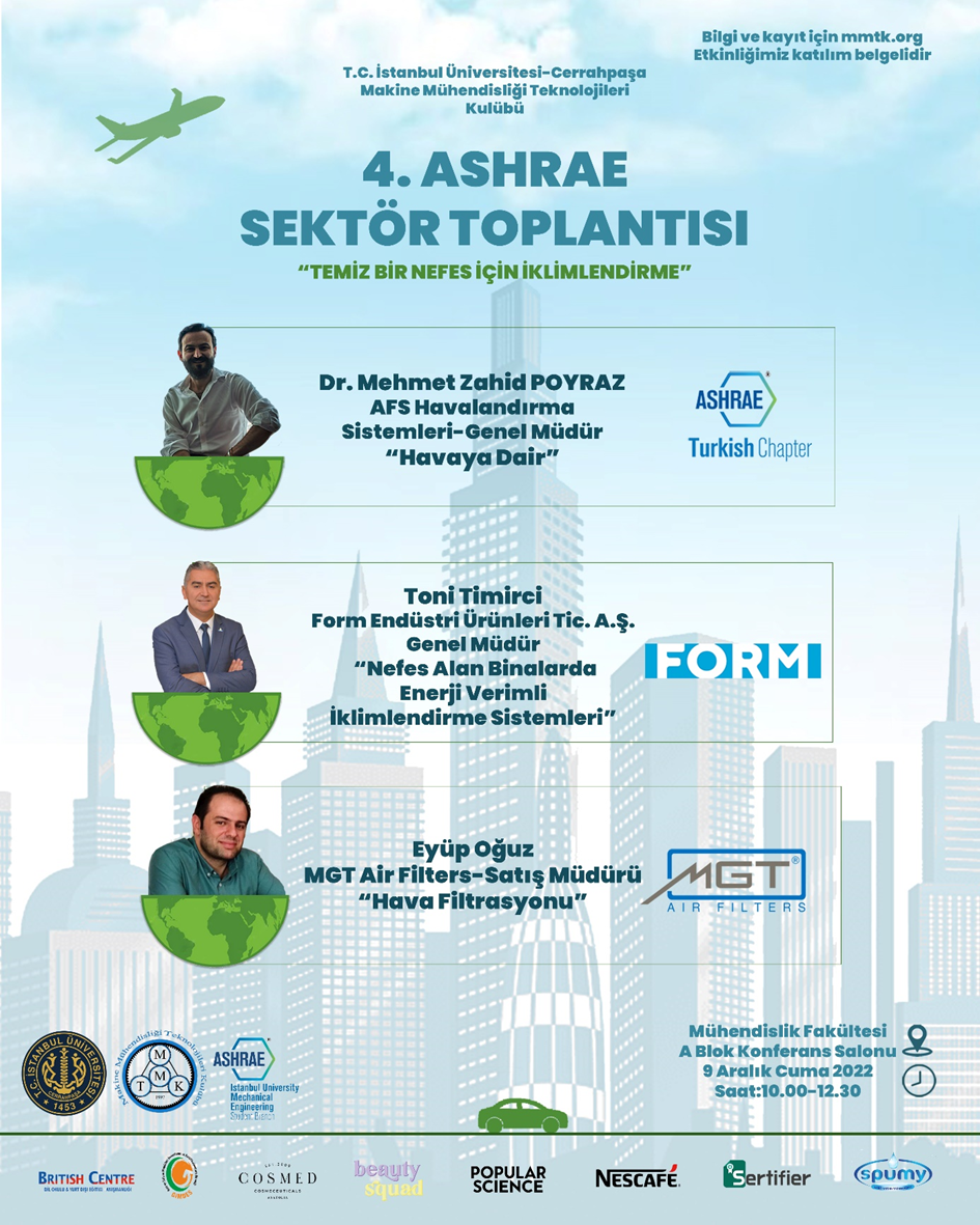 İstanbul Üniversitesi-Cerrahpaşa Makine Mühendisliği Teknolojileri Kulübü olarak düzenlediğimiz 4. ASHRAE Sektör Toplantısı, 9 Aralık 2022 tarihinde İstanbul Üniversitesi-Cerrahpaşa Avcılar Kampüsü’nde gerçekleştirilecek.